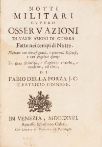 Della Forza Fabio, Notti militari ovvero osservazioni di varie azioni di guerra fatte nei tempi di Notte. Illustrate con diversi gravi, e piacevoli discorsi e con singolari esempi di gran Principi, e Capitani antichi, e moderni... In Venezia:...