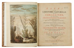 In-4° grande (mm 270x215). Pagine XVI, 1125, [3] + 1 antiporta incisa e 39 carte di tavole incise in rame fuori testo e numerate I-XXXIX delle quali 5 ripiegate, tutte in splendida coloritura coeva. Frontespizio in inchiostro rosso e nero, capilettera, testatine e finalini incisi in legno nel testo. Esemplare leggermente brunito e con un taglio riparato all'antiporta, ma marginoso e con le tavole in fresca e nitida tiratura. Legatura moderna in pieno vitello nocciola con cornici impresse in oro ai piatti  e titoli dorati su tassello al dorso. Timbri di collezione privata al frontespizio. Prima ed unica edizione francese di questa importante opera, il migliore testo sui coralli del Settecento. L'opera si fregia di 40 belle tavole anticamente colorate a mano, raffiguranti alghe e coralli, incise da James Kirk, J. Mynde et H. Roberts su disegni di Ehret. Cfr. Brunet II, 963; Nissen BBI, 590; Nissen ZBI, 1281; Pritzel 2961.