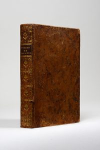 Réflexions philosophiques sur le plaisir ; par un célibataire. Neuchâtel ; Paris, chez l'auteur, veuve Duchesne, Le Jay, Desenne, Petit, 1783. In-8, veau marbré, dos lisse orné, tranches marbrées (Reliure de l'époque). Édition originale rare. Il s'agit de la toute première publication de Grimod de La Reynière (1758-1838), publiée à compte d'auteur à l'âge de vingt-cinq ans. La page de titre porte son monogramme en médaillon. Exemplaire relié dans un recueil avec quatre pièces de théâtre, toutes en édition originale : FENOUILLOT DE FALBAIRE. L'Honnête Criminel. Amsterdam ; Paris, Merlin, 1767. – FAVART. L'Anglois à Bordeaux. Paris, Duchesne, 1763. – PALISSOT. L'écueil des mœurs. Paris, Duchesne, Moutard, 1782. – PALISSOT. Le Satirique. Paris, Moutard, 1782. Table manuscrite de l'époque sur une garde. Un mors fendu, coins émoussés.