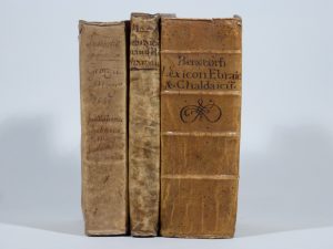 Ensemble trois ouvrages. MAYR (Georgius). Institutiones linguæ hebraicæ. Lyon, Antoine Jullieron, 1649. In-8, vélin souple (Reliure de l'époque). Nouvelle édition de cette grammaire hébraïque publiée dès 1616 par le jésuite Georgius Mayr (1564-1623). Manque de vélin sur les coins supérieurs. Sommervogel, V, 816. BUXTORF (Johann). Lexicon hebraicum et chaldaicum. Bâle, Johann König & fils, 1676. In-8, vélin souple, titre calligraphié au dos, tranches mouchetées (Reliure de l'époque). Huitième édition revue et augmentée de cet important dictionnaire hébreu-latin. Dos un peu assombri, intérieur roussi, cahiers R et S intervertis. [LIGHTFOOT (John)]. Horæ hebraicæ et talmudicæ, impensæ in Evangelium S. Johannis. Londres, Thomas Roycroft pour Benjamin Tooke, 1671.Petit in-4, vélin souple (Reliure de l'époque). Édition originale de ce commentaire de l'évangile selon saint Jean sous l'angle des études hébraïques et talmudiques. Quelques taches sur la reliure, petit trou en marge du f. Bb4.