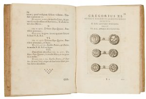 In-4° (mm 234x168). Pagine [8], 229, [1], 2 bianche + 34 carte di tavole incise in rame fuori testo. Frontespizio in inchiostro rosso e nero con emblemi papali entro vignetta calcografica, iniziali e finalini incisi in legno, testatine e moltissime illustrazioni nel testo incise in rame. Leggere e sporadiche fioriture ma buon esemplare. legatura coeva in piena pergamena rigida con titoli dorati entro tassello al dorso e tagli marmorizzati. Piatto posteriore con alcune piccole macchie. Timbro abraso al frontespizio. Una delle più importanti opere sulla numismatica pontificia. Il ricco apparato iconografico riproduce oltre 200 monete e medaglie suddivise in 34 tavole a piena pagina fuori testo e 15 figure incise in rame nel testo. Cfr. Choix XI, 16946.