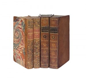Les Liaisons dangereuses, ou lettres recueillies dans une société, & publiées pour l'instruction de quelques autres. Amsterdam ; Paris, Durand Neveu, 1782. 4 tomes en 2 volumes in-12, veau fauve, dos lisse orné, pièces de titre et de tomaison brunes, tranches marbrées (Reliure de l'époque). Édition « C », à la date de l'originale. Selon lui, ce tirage dit à la roue dentée ne constitue pas une contrefaçon, mais une réimpression autorisée de l'édition originale par son éditeur. Bible du libertinage pour certains, le livre s'impose surtout comme chef-d'œuvre du roman d'analyse, comme un des romans les plus abstraits et les plus intelligents (En français dans le texte, n°174). De la bibliothèque Marcel Desjardin (2013, n°109), avec ex-libris. Coiffes et coins restaurés, petite restauration aux pp. 153-154 et 181-182 de la quatrième partie. Max Brun, p. 43.
