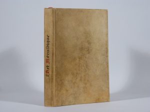 L'Art héraldique contenant la manière d'apprendre facilement le blason. S.l.n.d. [XVIIIe siècle]. Manuscrit de 162 pp. Petit in-4, vélin rigide, dos lisse orné du titre calligraphié en rouge et noir (Reliure du début du XXe siècle). Copie manuscrite de l'ouvrage de Jules Baron illustrée d'environ 250 blasons dessinés à la plume et peints en couleurs pour la plupart. Forte mouillure sur l'ensemble du volume, touchant quelques blasons ; quelques restaurations marginales ; déchirure sur un blason p. 85 ; un feuillet dérelié.