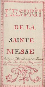 L'Esprit de la Sainte Messe. 1777. In-8, maroquin rouge à long grain, dos lisse orné, tranches dorées (Reliure de l'époque). Charmant manuscrit calligraphié à l'encre brune pour le texte, rouge pour les titres et initiales, et mêlant les deux couleurs pour les lettrines et l'ornementation. Il a été composé en 1777 par C. Petrée père, chef du bureau des produits généraux des fermes du Roi, pour son épouse Marie Marguerite de Postansque. Le titre et la dernière page sont ornés d'un cartouche finement calligraphié au chiffre de cette dernière. Quelques épidermures.