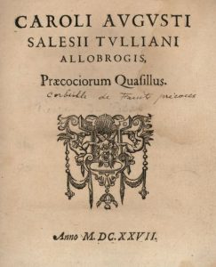 Præcociorum Quasillus. S.l. [Lyon], s.n., 1627. In-4, vélin (Reliure de l'époque). Édition originale de ce rare recueil de poésies latines. Envoi de l'auteur, en latin, à Dom Claude Fabre ou Lefèvre. Charles-Auguste de Sales (1606-1660) fut évêque de Genève de 1645 à sa mort. Il est l'auteur d'une biographie de son oncle, saint François de Sales, publiée à Lyon en 1634. Mouillure claire, quelques rousseurs. Brunet, V, 73.
