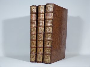 Le Grand théâtre sacré du duché de Brabant. La Haye, Chrétien van Lom, 1729. – LE ROY (Jacques). Le Grand théâtre profane du duché de Brabant. Ibid., 1730. 2 ouvrages en 3 volumes in-folio, veau marbré, dos orné, roulette sur les coupes, tranches jaspées (Reliure de l'époque). Première édition française, considéralement augmentée, de cette importante description historique du Brabant ecclésiastique et monastique, traitant successivement de l'archevêché de Malines, du doyenné de Bruxelles, de l'évêché d'Anvers et de celui de Bois-le-Duc. Très riche illustration comprenant 259 (sur 272) planches hors texte dont trois cartes et 5 planches dans le texte gravées en taille-douce par J. Harrewijn, R. Blokhuyzen, D. Coster et d'autres, parfois à double page ou repliées, représentant de grandes et belles vues à vol d'oiseau d'abbayes et de monastères des quatre quartiers du duché de Brabant, portraits de saints, armoiries, épitaphes, etc. On a relié à la suite la première et seule édition française du Grand théâtre profane du duché de Brabant et du Brabant-wallon, par Jacques Le Roy. Les deux parties de l'ouvrage sont illustrées d'une carte et de 71 (sur 72) planches hors texte contenant plus de 180 gravures sur cuivre. Bel exemplaire en reliures uniformes de l'époque, probablement hollandaises. Treize planches manquent dans le premier ouvrage ; le second est incomplet de la planche de numismatique. Reliures habilement restaurées, quelques rousseurs. Bibliotheca Belgica, V, 330 et III, 854 – Brunet, II, 1699.