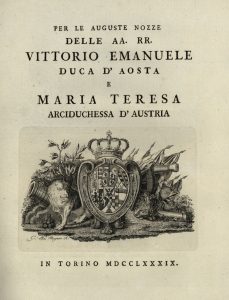 Per le auguste nozze delle AA. RR. Vittorio Emanuele duca d'Aosta e Maria Teresa arciduchessa d'Austria. Turin, Reale Stamperia, 1789. In-4 de [24] ff., broché, couverture de papier à la colle bleu, tranches mouchetées. Première édition de cette plaquette publiée en l'honneur du mariage de Victor-Emmanuel Ier de Savoie, alors duc d'Aoste, et de l'archiduchesse Marie-Thérèse d'Autriche-Este, célébré le 25 avril 1789. Les pièces recueillies – odes, élégies et sonnets en italien, en latin et en grec – sont signées de Brizio della Veglia, Leonardo Miniscalchi, Teodoro Bergera, Giovanni Bernardo Vigo, Giovanni Battista Operti, du comte Nicolis di Brandizzo et d'autres. L'ornementation se compose de deux vignettes armoriées gravées en taille-douce par G. B. Stagnon, une grande figure en-tête dessinée par Palladino et deux culs-de-lampe par Visca. Couverture un peu frottée, trace sombre dans l'angle inférieur des deux premiers feuillets. Bel exemplaire néanmoins.