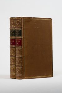 La Vraye histoire comique de Francion. Leyde, Henry Drumond, 1721. 2 volumes in-12, veau fauve, triple filet doré, dos orné, roulette intérieure, tranches dorées sur marbrure (M[ais]on Niédrée). Nouvelle édition de ce roman publié par Charles Sorel sous le pseudonyme de Nicolas de Moulinet, sieur du Parc, gentilhomme lorrain. Elle est ornée d'un titre-frontispice dans chaque volume et de dix figures hors texte, gravés sur cuivre. Ex-libris manuscrit sur une garde ancienne conservée : Mademoille Janette demeurant Rue pastourelle au marais du Temple à paris, 1741. Deux mors légèrement frottés et fendus.