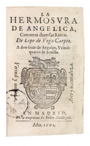 La Hermosura de Angélica, con otras diversas rimas. Madrid, Pedro Madrigal, 1602. 3 parties en un volume in-8, veau moucheté, triple filet à froid, dos orné, tranches jaspées (Ateliers Laurenchet). Édition originale d'une grande rareté. Dédiée par l'auteur à son ami et poète Juan de Arguijo, elle est ornée de ses armoiries répétées sur le titre de chacune des trois parties et d'un portrait de l'auteur à la fin des pièces liminaires, le tout gravé sur bois. La première partie contient le poème La Hermosura de Angélica en édition originale ; la deuxième, deux essais en prose et deux cents sonnets ; la troisième, La Dragontea, un poème épique sur le corsaire Francis Drake, déjà publié en 1598. Le recueil a été réimprimé avec des augmentations à Barcelone en 1604, puis de nouveau à Madrid en 1605. Aucun exemplaire de cette rarissime édition originale de Lope de Vega n'est répertorié dans les bibliothèques françaises. Mention manuscrite en espagnole sur un feuillet blanc relié avant le volume. Cachet ancien au titre. Exemplaire incomplet des ff. 356-361 et rogné assez court, avec atteinte à quelques lettres dans la marge latérale ; petites restaurations de papier à quelques feuillets, dont une supprimant quelques lettres au f. 322, des rousseurs. Exposición bibliográfica de Lope de Vega, n°754 – Palau, n°356330 – Profeti, pp. 132-137 – Salvá, I, n°2191 (« rare ») – Pérez Pastor, n°826 – Brunet, V, 1108.