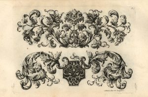 Nouveau livre d'ornemens d'orfèvrerie. Paris, N. Langlois, s.d. In-folio, cartonnage de papier marbré (Reliure moderne). Rare suite complète de six planches représentant douze motifs d'orfèvrerie, dessinées et gravées en taille-douce par Paul Androuet du Cerceau (1630?-1710). Petite mouillure dans la marge des cinq premières planches. Guilmard, 114 – Berlin Kat., n°834.