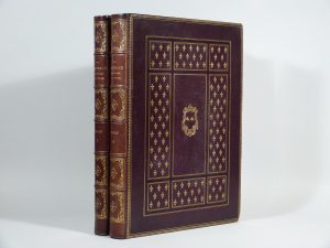 Les Châteaux historiques de la France. Paris et Poitiers, H. Oudin frères, 1878-1879. 2 volumes in-4, maroquin aubergine, double encadrement de filets dorés, plats ornés de compartiments décorés d'un semé de fleurs de lis et d'un cartouche central contenant un chiffre sur le plat supérieur et un médaillon azuré sur le plat inférieur, dos orné, dentelle intérieure dorée, doublures et gardes de moire violette, tranches dorées (Oudin). Édition originale, illustrée de nombreuses gravures à l'eau-forte exécutées sous la direction d'Eugène Sadoux, dont 49 hors texte. Ces deux premiers volumes sont consacrés aux châteaux d'Anet, Bonneval, Les Vaux de Cernay, Bussy-Rabutin, Vizille, Chastellux, Époisses, Oyron, Bazoches, Rambures, Chambord, Sully-Saint-Léger, Sully-sur-Loire, La Rochefoucauld, Amboise, Josselin, Serrant, Vigny, Montal, Castelnau de Brétenoux et La Grangefort-sur-Allier. Un des 100 exemplaires sur hollande, numéroté et signé par l'éditeur, dans une superbe reliure fleurdelisée au chiffre G. G. Sans le troisième volume publié en 1881. Dos et un mors insolés, quelques rousseurs et reports de gravures.