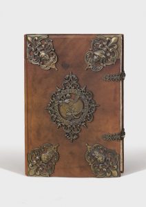 A Magyar képirás úttörői. Budapest, Franklin-Társulat, 1905. In-4, bradel chagrin fauve sur ais de bois, important décor en métal ouvragé sur le plat supérieur composé de quatre écoinçons à l'effigie d'artistes hongrois, d'un grand médaillon central formé d'une palette de peintre ceinte du titre de l'ouvrage et de deux fermoirs décorés, plat inférieur orné de quatre cabochons en métal doré, dos lisse orné de filets à froid, doublures et gardes en papier orné d'un riche décor vert amande, rouge, blanc et doré, non rogné (Reliure de l'éditeur). Superbe publication sur les pionniers de l'art hongrois, tels János Kupeczky, Ádám Mányoki, Károly Markó, Károly Brocky, Miklós Barabás, Antal Ligeti, Mór Thán, Sándor Liezen-Mayer, Gézá Mészöly et Mihály Munkácsy. L'ouvrage est illustré de quarante-neuf reproductions en noir et en couleurs et de quatre documents en fac-similé. Les pages de gardes chromolithographiées et les ornements tirés en rouge et noir dans le texte sont l'œuvre de Sándor Nagy. Envoi autographe signé de l'auteur au comte Melchior de Polignac (1856-1925) sur le titre. Ancien élève de l'École des Chartes, celui-ci a traduit plusieurs ouvrages du hongrois et a publié une anthologie de Poésies magyares en 1896 – dans laquelle il présente son ami Dezső Malonyay comme « l'un des membres les plus brillants de la littérature hongroise » (p. viii) – et des Notes sur la littérature hongroise en 1900. Magistrale reliure art nouveau en chagrin parée d'ornements en cuivre ouvragé.