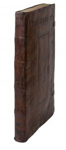 2 parti in 1 volume in-folio (mm 425x280). Carte 46 [1]; 105, [1]. Frontespizio in inchiostro rosso, grande marca tipografica incisa in fine della prima parte, ripetuta in inchiostro rosso al colophon della seconda parte. Spazi per capilettera con letterine-guida, alcuni calligrafici. Qualche forellino di tarlo all'ultima carta e ampia ma lieve gora d'acqua nel margine di alcune carte finali ma buon esemplare ad ampi margini. Legatura muta coeva in piena pelle con due cornici concentriche impresse a secco ai piatti riquadrate da triplici filetti, la più esterna formata da putti alati; sguardie rivestite con fogli pergamenacei di antico antifonario e fermagli perfettamente conservati. Numerosi forellini di tarlo ai piatti. Edizione sconosciuta a tutti i repertori consultati, rara.