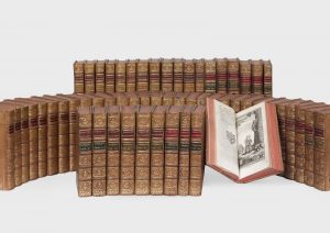 Histoire naturelle, générale et particulière. Nouvelle édition. Paris, Imprimerie royale, 1769-1789. 54 volumes in-12, veau blond moucheté, triple filet doré, fleurons aux angles internes, dos orné, pièces de titre rouges et de tomaison citron ou vertes, dentelle intérieure, tranches rouges (Reliure de l'époque). Belle édition du chef-d'œuvre de Buffon donnée par l'Imprimerie royale, la première au format in-12 pour l'Histoire naturelle des oiseaux et celle des minéraux. Ces 54 volumes sont illustrés de 688 planches hors texte gravées en taille-douce, dues pour l'essentiel à Jacques de Sève. Composition : Histoire naturelle. 1769-1770. 13 vol. – Suppléments. 1774-1789. 14 vol. – Oiseaux. 1770-1785. 18 vol. – Minéraux. 1783-1788. 9 vol. On joint : LACÉPÈDE (Bernard-Germain de). Histoire naturelle des quadrupèdes ovipares et des serpens. Paris, Hôtel de Thou, 1788-1790. 4 vol. en reliure uniforme, illustrés de 49 planches hors texte. Sans les Poissons et les Cétacés de Lacépède, parus bien plus tard (1798-1804). Ensemble en belle condition et très décoratif, malgré quelques légères différences de fers au dos des derniers volumes. Menus accidents aux reliures. Nissen : ZBI, n°673.