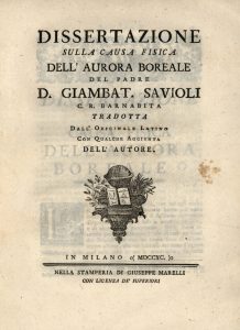 De auroræ borealis origine. Prælectio habita in gymnasio maceratensi V idus novembris MDCCLXXVIII. Macerata, Bartolomeo Capitani, s.d. [1778]. Plaquette in-8 de 15 pp., bradel cartonnage gris (Reliure moderne). Rare conférence sur les aurores boréales, dans laquelle l'auteur présente les thèses de Gassendi, Halley, Mairan et Franklin. On joint : SAVIOLI (Giambattista). Dissertazione sulla causa fisica dell’ aurora boreale. Milan, Giuseppe Marelli, 1790. Plaquette in-4 de 44 pp., broché, couverture en papier marbré. Première édition en italien, traduite du latin et augmentée par l'auteur.