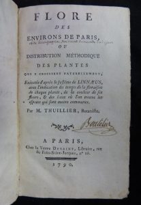 Flore des environs de Paris, ou distribution méthodique des plantes qui y croissent naturellement. Paris, veuve Desaint, 1790. — JÖRLIN (Engelbert). Principia botanices illustrata, seu partes fructificationis, characteribus, terminis technicis, figuris illustratæ. Lund, J. Lundblad, 1786. 2 ouvrages en un volume in-12, demi-basane brune avec coins de vélin, dos lisse, tranches rouges (Reliure de l'époque). Édition originale de la flore de l'Île-de-France de Thuillier, organisée d'après la classification botanique de Linné. On a relié à sa suite la seconde édition augmentée de l'opuscule de Jörlin, originellement paru en 1771, également à Lund en Suède. Les 6 planches qui illustrent l'ouvrage manquent au présent exemplaire. De plus, une planche de sujets botaniques gravée sur cuivre par Petter Wynbergh a été fixée à une garde du volume (petite déchirure sans manque). Exemplaire constitué par un botaniste de l'époque, nommé Boutelier, qui y a ajouté d'abondants commentaires, dans les marges et sur des feuillets insérés — inspirés, semble-t-il, de la Flore de Bourgogne de Jean-François Durande (1782). L'amateur a fait relier en fin de volume 24 ff. n. ch. d'appendices de sa main : une copie du Sistème de Linnée [sic], des notes sur les espèces de champignons et sur la flore de Suisse, un tableau dépliant résumant la classification de Linné suivie de 6 pp. de nomenclature, et enfin une planche dépliante représentant des spécimens botaniques dessinés et légendés à l'encre brune. Reliure usée avec manques, pâle mouillure sur un tiers du volume. Pritzel, nos 9256 et 4440.