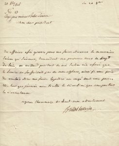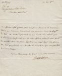 Lettre autographe signée. Paris, 22 octobre 1806. 1 page in-4, cachet de cire. Au Président de la Cour de Cassation « des affaires assez graves pour faire braver la mauvaise saison qui s’avance, demandent ma présence dans le département de l’Ain… ». Il demande un congé dont il n’usera qu’avec toute la discrétion que comportent les circonstances (c’est la campagne de Prusse).