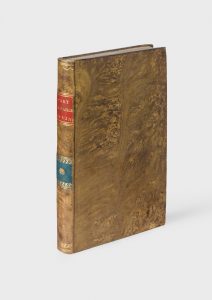 L’Art de faire, gouverner, et perfectionner les vins. Paris, Delalain fils, de l'imprimerie de Marchant, an X – 1801. In-8, bradel cartonnage ocre flammé, dos lisse orné, pièces de titre rouge et bleue, tranches mouchetées (Reliure de l'époque). Édition originale de toute rareté du premier grand traité d’œnologie de Chaptal, traitant de la fermentation, du climat, des sols, de l'atmosphère, des maladies, etc. Exemplaire de premier tirage, à l’adresse du Quai des Augustins, n°29, avec la mention De l’imprimerie de Marchant et le feuillet de table non chiffré. La première page du texte est titrée Essai sur le vin par le C. Chaptal et porte dans la marge inférieure la mention Tome II. Cet état semble être un tiré à part du Traité théorique et pratique sur la culture de la vigne de Chaptal, Rozier, Parmentier et Dussieux paru la même année chez le même éditeur. Séduisant exemplaire en joli cartonnage de l’époque. Petites usures au cartonnage. Oberlé, n°949 – Fritsch, n°118 – Chwartz, n°12 – Simon Vin., 18.