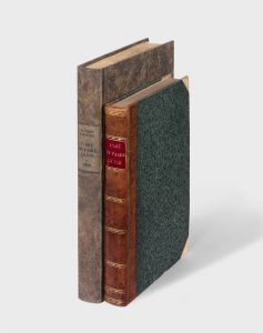 L’Art de faire le vin. Paris, Deterville, 1819. In-8, demi-basane racinée avec coins de vélin blanc, dos lisse orné de roulettes dorées, pièce de titre rouge, tranches jaunes mouchetées (Reliure de l'époque). Édition définitive, la dernière publiée du vivant de l'auteur. Malgré la mention de Deuxième édition imprimée sur le titre, il s'agit en réalité de la troisième. Elle reproduit celle de 1807, à l'exception des chapitres sur l'alcool et la distillation, qui sont entièrement remaniés. Elle est illustrée d’une planche dépliante dessinée et gravée par J. E. Thierry. Séduisant exemplaire en reliure de l'époque. Signature de l'époque biffée sur le titre. Rares petites rousseurs. On joint, du même : L’Art de faire le vin. Paris, Bouchard-Huzard, 1839. In-8, bradel cartonnage marbré, non rogné, couverture (Reliure moderne). Édition augmentée de la Manière de faire le vin, par Louis Poirot de Valcourt, avec deux planches dépliantes, l’une gravée, l’autre lithographiée. Couverture doublée avec manques, rousseurs et mouillures.