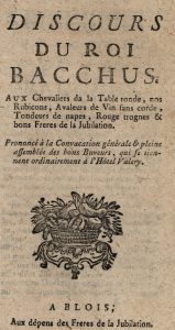 aux chevaliers de la Table ronde, nos rubicons, avaleurs de vin sans corde, tondeurs de napes, rouges trognes et bons frères de la jubilation. Prononcé à la convacation générale et pleine assemblée des bons Buveurs, qui se tiennent ordinairement à l’Hôtel Valery. Blois, aux dépens des Frères de la jubilation, s.d. In-16 de 12 pp., bradel cartonnage de papier décoré (Reliure moderne). Très rare pièce de colportage présentée dans une édition non répertoriée. C’est un éloge de l’ivrognerie avec des références savantes, écrit Gérard Oberlé en décrivant une autre édition publiée à la même adresse mais datée de [18]21, qui a sans doute été imprimée à Caen par Pierre-Théodore Chalopin. Corrections manuscrites de l’époque au début du texte. Petit trou touchant quelques lettres aux pp. 7-8. Fritsch, n°535.