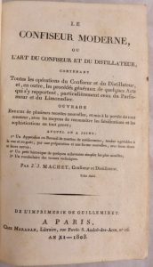 Le Confiseur moderne, contenant toutes les opérations du confiseur et du distillateur... Paris, Staradan, 1803. In-8, basane racinée, dos lisse, fleurons et urnes dorés, pièce de titre de maroquin rouge (Reliure de l’époque). XVI - 461 p. Édition originale très rare de ce grand traité classique. Excellentes recettes de confitures, glaces, ratafias, sirops, vinaigres, fruits séchés, compotes, gâteaux utilisant les feuille, les fleurs et les fruits d’un grand nombre de végétaux. Fine restauration aux coins. Vicaire 546.