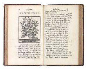 Discours du tabac, où il est traité particulièrement du tabac en poudre, par le Sr Baillard. Paris, Martin Le Prest aux dépens de l'auteur, 1668. Petit in-8, veau marbré, dos orné, coupes décorées, tranches jaspées (Reliure de l'époque). Édition originale de ce livre sur le tabac à priser, « the first work of its kind published » (Arents), composé par Jean Le Royer de Prade, l'ami de Cyrano de Bergerac, dont l'identité ne fut révélée que dans la seconde édition. Cette première édition est de la plus grande rareté. Bragge n'avait que l'édition de 1677 (Bibliotheca nicotiana, n°81). « Prade distingue trois sortes de tabac, le tabac mâle qui fleurit continuellement dans le Brésil, le tabac femelle aux feuilles plus étroites qui se produit de la graine du mâle lorsqu'elle dégénère, et le petit tabac qui pousse au Brésil, Bornéo, pays des Amazones, Virginie, Isles de Sainte-Marguerite, de Saint-Luc, de Saint-Christophe, en Italie, France, Hollande, Angleterre. Il raconte sa découverte, donne des précisions sur la culture, et examine les faits et méfaits du tabac sur le plan médical. Pour lui, le tabac est une panacée, qu'il soit utilisé en poudre ou en fumée » (Gérard Oberlé). L'ouvrage est orné de trois gravures sur bois à mi-page montrant les plants des trois types de tabac. Signature ancienne au titre et au premier contreplat : Longeaux, 1719. De la bibliothèque Carlo Cassinelli, avec ex-libris. Mors supérieur fendu, manques sur les coiffes et deux coins. Arents, II, 300 – Krivatsky, n°9251 – Oberlé, n°1144.