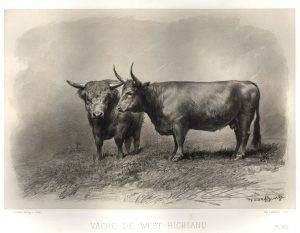 Les Races bovines au concours universel agricole de Paris en 1856. Études zootechniques. Paris, Imprimerie impériale, 1861-1862. 2 volumes in-folio oblong, demi-chagrin vert, dos orné de filets dorés (Reliure de l'époque). Édition originale du livre le plus important publié sur les races bovines de France, Royaume-Uni, Hollande, Danemark, Suisse, Allemagne et Autriche-Hongrie. L'illustration se compose de 87 très belles planches dessinées par Riffaut et réalisées par Lemercier suivant un savant mélange de transposition photographique sur une plaque de métal, de retouches manuelles et de lithographie sur fond teinté. Le volume de texte contient, outre l'introduction d'Émile Baudement, cinq cartes hors texte gravées en couleurs. Mouillure claire sur les 50 dernières planches ; quelques rousseurs. Bel exemplaire néanmoins.