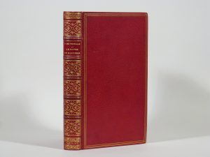 Le Moyen de parvenir. Œuvre contenant la raison de ce qui a esté, est et sera, avec démonstrations certaines selon la rencontre des effects de vertu. Paris, Léon Willem, 1870-1872. 2 tomes en un volume in-8, maroquin rouge, triple filet doré, dos orné aux petits fers, dentelle intérieure dorée, tranches dorées (Smeers). Édition hors commerce publiée « par un bibliophile campagnard », avec notes, variantes, index, glossaire et notice bibliographique. Elle est ornée d'un portrait de l'auteur et d'une vignette gravée sur bois en tête de chaque chapitre. Un des quelques exemplaires sur chine dans une élégante reliure de l'époque signée d'Isidore Smeers. Quelques rousseurs éparses. Vicaire, I, 433.