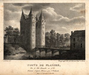 Collection des anciennes portes de Bruxelles et autres vues remarquables du royaume des Pays-Bas. [Bruxelles, Burggraaff, 1823]. In-4, demi-basane verte, dos lisse orné d'un cartouche de titre doré, tranches mouchetées (Reliure de l'époque). Suite très rare de 19 (sur 20) vues lithographiées par Alexandre Boëns d'après les dessins de Paul Vitzthumb. On a relié à la suite 10 lithographies éditées par Jobard, dont 7 par Jean-Baptiste Madou, présentant des vues de Belgique. Manquent une planche et le titre lithographié ; des rousseurs.