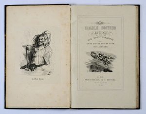 Le Diable boiteux. Paris, Bourdin et Cie, 1840. In-4, bradel demi-maroquin vert avec coins, non rogné, couverture et dos (Reliure de la fin du XIXe siècle). Premier tirage du frontispice et des 140 vignettes de Tony Johannot. Un des quelques exemplaires sur chine. De la bibliothèque Charles Bouret (1893, n°357), avec ex-libris. Menus frottements à la reliure. Carteret, III, 388.
