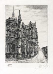 Reims à l’eau-forte. Reims, Matot-Braine, 1904. Grand in-folio, monté sur onglets, demi-maroquin vert foncé avec coins, tête dorée, couverture (Matot-Braine). Édition originale de cette somptueuse publication renfermant 41 eaux-fortes originales de Léopold Lesigne montées hors texte sur vélin blanc. Ces planches représentent les principaux chefs-d'œuvre de l'histoire artistique de la ville, monuments, églises, rues, places, fontaines, etc. Le texte explicatif qui les accompagne, par A.-E. André, P. Aubin, A. Baudon, E. Brodiez, E. Brunette et d'autres, est orné de vingt-sept en-têtes, dix vignettes et vingt-six culs-de-lampe dessinés par E. Auger, V. Charlier, de Perthes, A. Gosset, E. Kalas et L. Lesigne. L'ouvrage, publié à 400 exemplaires, a paru en vingt fascicules, sous pagination séparée. Les deux derniers sont consacrés au vin de Champagne et aux caves Pommery. Un des 50 exemplaires de tête avec les eaux-fortes tirées sur parchemin, en épreuves avec remarques signées par l'artiste à la mine de plomb, dans sa première reliure d'éditeur. Menus frottements sur les coiffes et les nerfs, une serpente déchirée avec manque. Lhermitte : Champagne, n°466.