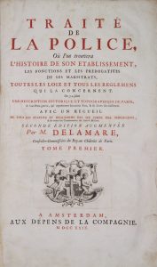 Lamare Nicolas (de), Traité de la police, où l'on trouvera l'histoire de son etablissement, les fonctions et les prerogatives de ses magistrats, toutes les loix [...]. On y a joint une description historique et topographique de Paris [...]. Tome...