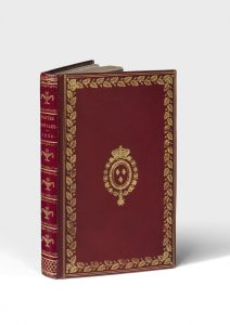 État général des postes du royaume de France, pour l’an 1824. Paris, Imprimerie royale, 1824. In-8, maroquin rouge à long grain, large roulette de feuilles de chêne dorée, armoiries au centre, dos lisse orné, roulette intérieure dorée, doublures et gardes de moire bleue, tranches dorées (Reliure de l'époque). Grande carte de France coloriée repliée en fin de volume. Très bel exemplaire sur papier vélin relié en maroquin rouge aux armes royales. Il a appartenu au marquis Louis de Vaulchier du Deschaux (2005, n°101), directeur général des Postes d'août 1824 à novembre 1828. C'est encore le nom du duc de Doudeauville, son prédécesseur à ce poste, qui est imprimé dans le volume (p. 31). Menue épidermure sur le plat inférieur, petit travail de ver dans la doublure.