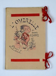 L'Ombrelle, le gant, le manchon. Paris, A. Quantin, 1883. Grand in-8, broché, couverture illustrée en couleurs et doré, non rogné, et une suite d'illustrations du même format, en feuilles, portefeuille en soie rose illustrée, lacets rouges, chemise et étui (détériorés). Édition originale, illustrée par Paul Avril de nombreuses compositions dans le texte, en différents tons. Un des 100 exemplaires de tête sur japon avec une des 150 suites à part des illustrations. Bel exemplaire broché dans ses jolies couvertures illustrées en papier et en soie. De la bibliothèque de la Sinetterie, avec ex-libris manuscrit. On joint une lithographie coloriée de mode féminine. Vicaire, VII, 923.