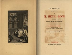 Les Exercices de dévotion de M. Henri Roch avec Madame la duchesse de Condor. Édition revue sur l'édition originale sans lieu ni date et sur l'édition de Vaucluse, 1786. Amsterdam, aux dépens de la Compagnie, s.d. [Bruxelles, Auguste Poulet-Malassis, 1864]. In-12, broché, couverture muette, non rogné. Édition rare de ce conte libertin attribué à l'abbé de Voisenon. Tirage à 155 exemplaires numérotés et paraphés, celui-ci un des 150 sur vergé, avec le frontispice érotique en double état, en noir et en sanguine. L'édition fut condamnée à la destruction par le tribunal correctionnel de la Seine le 2 juin 1865. Couverture plastifiée, dos fendu. Pia, 467 – Dutel, A-381.