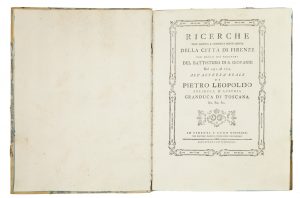 In-4° (mm 268x204). Pagine 112 + 1 carta di tavola xilografica più volte ripiegata con il Ristretto de' Battezzati al sacro Fonte di San Giovanni. Frontespizio e testo inquadrati da cornice tipografica, fregio con due piccoli ritratti in ovale al frontespizio, capilettera, testatine e finalini xilografici. Esemplare ad ampi margini in carta forte, internamente in ottimo stato di conservazione. Legatura coeva in mezza pergamena con punte e piatti marmorizzati, titoli impressi in oro al dorso e tagli blu. Piccola lacuna alla cuffia superiore e altri minimi difetti. Rara e importante opera di demografia, in cui si ripercorrono le vicende demografiche della popolazione di Firenze in oltre 300 anni. Cfr. DBI, ad vocem: L'opera si ispira ai «dibattiti sulla cosiddetta "aritmetica politica" sorti in Inghilterra, in Francia, nel Piemonte sabaudo e nella Lombardia asburgica [...]. La novità proposta dal L. consisteva nel calcolare la popolazione sulla base di un coefficiente dedotto dal numero delle nascite, che avrebbe dovuto confermare o correggere i dati dei censimenti ufficiali. Riflessioni statistiche e analisi storiche fecero delle Ricerche uno dei primi lavori di demografia storica»; Moreni I, 508.