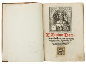 In-folio (mm 310x205). Carte [70], 295, senza l'ultima bianca. Grande vignetta con ritratto dell'Autore e marca dello stampatore incise in legno al frontespizio stampato in inchiostro rosso e nero, altra marca in fine; graziosi capilettera xilografici, alcuni molto grandi, su fondo nero puntinato e figurati, grande cornice istoriata con episodi della storia romana a carta 1r e 31 belle vignette figurate in principio di ciascun libro. Piccolo strappetto riparato al frontespizio, macchie d'unto sulla marca al frontespizio e su poche testatine ma bella copia. Legatura moderna in mezza pelle con dorso settecentesco restaurato e rimontato su assi di legno mancanti dei fermagli. Ex libris Teodoro Becu al contropiatto anteriore. Alcune postille a margine di antica mano Edizione delle Decadi a cura di Lucas Panaetius, cui è aggiunto il De primo bello punico di Leonardo Bruni. L'edizione è particolarmente apprezzata per le xilografie che la illustrano, utilizzate qui per la prima volta. L'opera è adorna di un bel ritratto dell'Autore al frontespizio, di una bordura in principio del primo libro composta da episodi della storia romana e da 10 legni posti a mo' di testatine in principio di ciascun libro delle 3 parti (Ab urbe condita, De secundo bello punico, De bello macedonico); le vignette che aprono ciascuna decade e quella in principio dell'opera del Bruni sono più grandi. L'incisore è Andrea Zoan, il cui monogramma z.a. compare anche su parte delle altre illustrazioni. Cfr. Essling 41, a proposito del ritratto: «cette gravure d'un style tout à fait original, est certainement  une des meilleures que nous connaissons de Zuan Andrea»; Sander 4004.