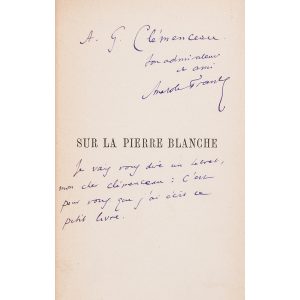 Exemplaire enrichi d’un envoi autographe signé d’Anatole France à G. Clemenceau : « son admirateur et ami. Je vais vous dire un secret, mon cher Clémenceau [sic] : c’est pour vous que j’ai écrit ce petit livre