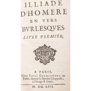 [HOMÈRE]. Illiade d’Homère en vers burlesques. Paris, Louis Chamhoudry, 1657 ; pet. in-12, maroquin vert orné de filet à froid et de motifs dorés sur les plats, dos à nerfs orné de motifs dorés, date en queue, tranches dorées, [Wagner].