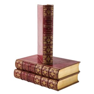 HORACE. [Œuvres]. Traduction en vers. Paris, Librairie des Bibliophiles, 1873-1874 ; 3 vol. pet. in-8, maroquin rubis, trois filets dorés en encadrement sur les plats, dos à nerfs orné de motifs dorés, tranches dorées, encadrement...