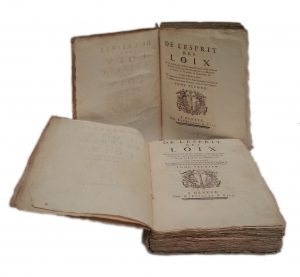 2 volumi in-4° (mm 270x215). Pagine [8], XXIV, 522; [4], XVI, 564, [2] bianche. Marca tipografica sui frontespizi. Lievi bruniture a poche carte e uno strappo marginale a pagina 65 ma bellissima copia in barbe, nella sua legatura cartonata settecentesca. Dorso parzialmente staccato al primo volume e un po' allentato al secondo. Prima rarissima edizione di questa celeberrimo monumento della letteratura e del diritto, pietra miliare del costituzionalismo moderno, pubblicata anonima a Ginevra nel 1748. L'opera conobbe fin da subito un successo inaudito, come testimoniano le oltre 20 contraffazioni (o se si vuole, ristampe) edite nei successivi due anni. Le copie della prima edizione, come nel caso del nostro esemplare, non hanno l'errore di ortografia nel nome dell'editore (scritto Barillot con una "r" di meno nella contraffazione) e il foglio di errata legato in fine, che compaiono invece nella prima contraffazione parigina del gennaio 1749 - pubblicata con l'indirizzo di Barrillot e senza data. Cfr. PMM 197: «In many ways one of the most remarkable works of the eighteenth century [...]. It is an always original survey which is neither doctrinaire, visionary, eccentric, nor over-systematic».