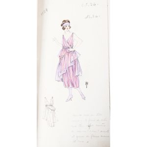 La plupart des tenues sont accompagnées d’un croquis complémentaire à la mine de plomb, du dos du vêtement ou d’un détail important, et de quelques lignes manuscrites de description précise. Deux des dessins sont également pourvus d’échantillons de tissu. Sur chaque recueil sont précisés la saison et le nom de la première d’atelier probablement responsable de la réalisation des modèles.