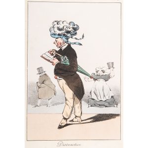 10 planches lithographiées par Villain d’après Henry Monnier, rehaussées à l’aquarelle et montées sur onglet. Première série complète des Modes et ridicules.