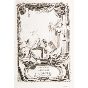 [116] p., puis paginé de 117 à 888, 4 p. Édition originale. Ornée d’un joli frontispice gravé sur cuivre et de bandeaux gravés sur bois. Périodique à parution bi-hebdomadaire, le lundi et le jeudi, augmentée d’un supplément bi-mensuel. Réunion des 100 numéros (sans le n° 99 du 25 décembre, jamais paru) publiés en 1763 de ce journal d’annonces réparties selon les rubriques suivantes : « Biens seigneuriaux à vendre », « Biens en roture à vendre ou à louer », « Maisons ou emplacemens à vendre », « Maisons ou appartemens à louer », « Charges, offices ou rentes à vendre », « Ventes », « Annonces et avis divers », « Demandes particulières », « Spectacles » et « Enterremens ». On peut ainsi acheter des terres, des corps-de-logis, des appartements de garçon, des boutiques, des liqueurs, des chevaux ou des chaises de poste. On y apprend aussi de curieuses informations ; ainsi en 1762, « 29 personnes [sont] mortes tant en France que dans les pays étrangers, depuis l’âge de 100 ans jusqu’à 157 [!] ». On y recherche également des personnes disparues, telle une certaine dame Françoise-Charlotte de Brôze, ou de mystérieux objets, à l’exemple de cette « désobligeante, où l’on pût tenir 2, à l’aise dans le fond ». Une mine ! Mouillure angulaire affectant la moitié de l’ouvrage, rousseurs éparses.