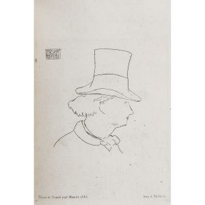 Exemplaire enrichi d’une eau-forte originale sur papier de Chine d’Édouard Manet, Charles Baudelaire de profil en chapeau II, 1862 (3e état sur 3, monogrammé dans la plaque, 10,5 x 9 cm), épreuve imprimée par A. Salomon et publiée dans une biographie posthume du poète par Charles Asselineau (Paris, Lemerre, 1869, p. 79).