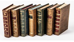 Reliures en maroquin rouge à grains longs pour l’un, en veau (marbré, vert, bleu et blond) pour les autres, ornées de motifs dorés et de symboles cosmiques ou zodiacaux.