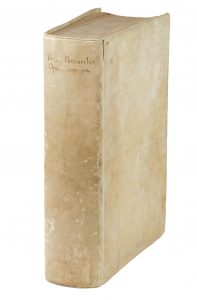 In-folio (mm 340x210). Pagine [28], 1131, 1 bianca; 205 (bianche le pagine 119-120), [3]. Ritratto dell'Autore al frontespizio e alcuni capilettera xilografici. Esemplare brunito, con abrasione al frontespizio e piccola lacuna reintegrata nell'angolo superiore esterno, tarlo marginale negli ultimi fascicoli e strappi che interessano l'inciso in 3 carte di testo, talvolta riparati con pecetta (Kk3, Kk7, Oo5). Legatura settecentesca in piena pergamena rigida con titoli manoscritti al dorso, un poco lisa. Nota di possesso manoscritta al frontespizio, ex-libris Bruno Cammarella al contropiatto anteriore. Edizione delle Opere del Petrarca per le cure di Johannes Basilius Herold, come si ricava dalla prefazione datata 1554. Cfr. Mansard 85.