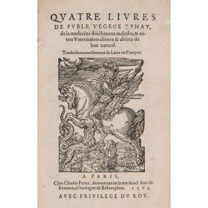 VÉGÈCE (Puble Végèce Renay). Quatre livres de la medecine des chevaux malades, & autres veterinaires aliénez & altérez de leur naturel. Paris, Charles Perier, 1563 ; gr. in-8, parchemin sable, dos lisse avec titre et millésime à froid,...