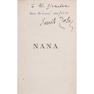 Enrichi d’un envoi autographe signé de Zola à M. Giraudeau, sur un bifolium volant, provenant d’un autre exemplaire, sur papier d’édition.