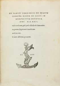 Plautus Titus Maccius, Comoediis XX quarum carmina magna ex parte in mensum suum restituta sunt ... (Al colophon:) Venetiis: in Aedibus Aldi, et Andreae Asulani soceri mense iulio 1522.